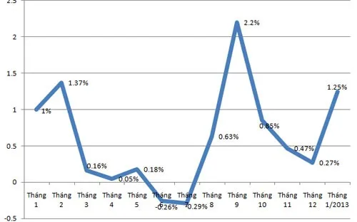 Gấp 4 lần mức tăng của tháng 12/2012, CPI tháng 1/2013 đã ghi dấu ấn khi tạo thêm niềm tin cho một số người vốn vẫn hoài nghi từ năm trước với quy luật “2 tăng 1 giảm” của CPI tại Việt Nam. Xét về mặt con số, CPI tháng 1/2013 tương đương với tháng 1/2010 (+1,36%) năm mà CPI đã quay đầu tăng mạnh trở lại hai con số (+11,75%) sau mức tăng 6,52% của năm 2009.