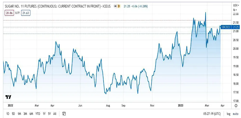 Tính tới ngày 30-3, giá đường thế giới ghi nhận mức tăng khoảng 30% kể từ cuối tháng 10-2022. Trên sàn ICEEU, giá đường tinh luyện No.5 kỳ hạn tháng 5-2023 giao dịch quanh mức 618,4USD/tấn, tương đương mức đỉnh đã từng thiết lập hồi năm 2016. Giá đường thô No.11 cùng kỳ hạn giao dịch quanh mức 21,25 cent/pound. Tại Trung Quốc, giá đường trắng giao ngay quanh mức 6.129NDT/tấn, tăng khoảng 6,6% so với hồi đầu năm.