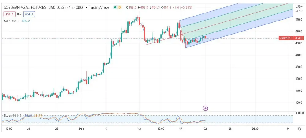 Theo góc nhìn phân tích kỹ thuật, giá hợp đồng tương lai khô đậu nành sàn CBOT kỳ hạn tháng 1-2023 đang hình thành kênh giảm giá với xu hướng đỉnh sau thấp hơn đỉnh trước, đáy sau thấp hơn đáy trước. Giá chịu áp lực bán ở vùng 468-470USD/tấn. Dự kiến giá giảm về vùng 410-415USD/tấn vào cuối tháng 1-2023. Yếu tố cơ bản hỗ trợ cho góc nhìn kỹ thuật, đó là hoạt động chốt lời của các nhà giao dịch khi mức định giá đã phản ánh xong các kỳ vọng về nhu cầu tiêu thụ ở Trung Quốc, cũng như đánh giá rủi ro nguồn cung ở Argentina.