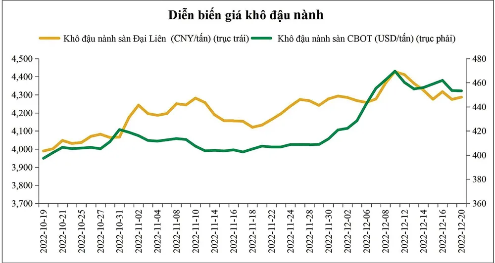 Sau khoảng thời gian tăng giá 2 tháng trước đó, với mức tăng hơn 20%, thị trường khô đậu nành đã có dấu hiệu tạo đỉnh vào ngày 9-12. Tính đến ngày 20-12, giá hợp đồng kỳ hạn tháng 1-2023 trên sàn CBOT giao dịch quanh mức 455USD/tấn, tương ứng giảm 4,1%. Cùng thời điểm, giá khô đậu nành trên sàn Đại Liên (Trung Quốc) giao dịch quanh mức 4.287NDT/tấn, tương ứng giảm 3,7%.