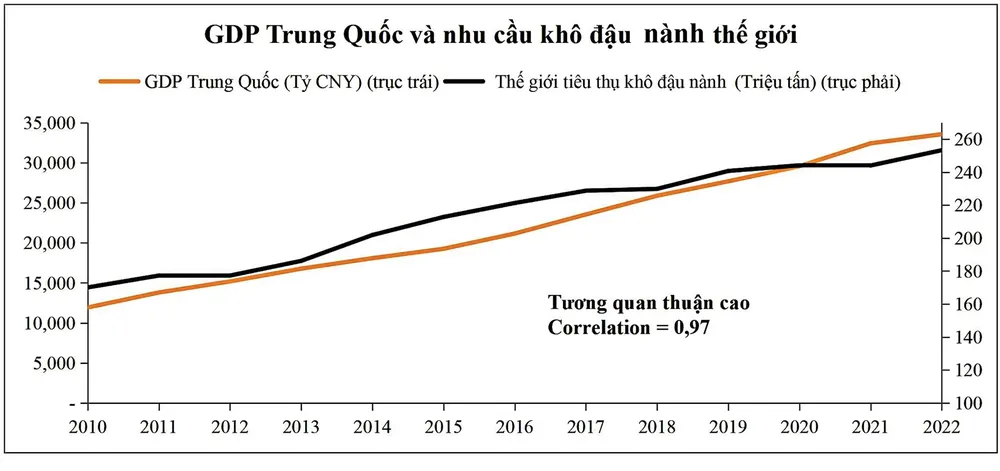 Báo cáo tháng 12 của Bộ Nông nghiệp Mỹ về cung - cầu, cho thấy nguồn cung đậu nành và khô đậu nành mùa vụ hiện tại dồi dào nhờ sản lượng tăng mạnh ở khu vực Nam Mỹ, đặc biệt là Brazil (quốc gia thu hoạch đậu nành lớn nhất). Nhu cầu tiêu thụ khô đậu nành cũng được dự báo tăng tốt trong mùa vụ 2022-2023, trong bối cảnh dự kiến kinh tế Trung Quốc tăng trưởng nhanh trở lại sau khi trải qua giai đoạn miễn dịch cộng đồng đối với đại dịch. Bởi nhu cầu tiêu thụ khô đậu nành của thế giới có đặc điểm tương quan thuận rất cao đối với GDP của Trung Quốc, với mức correlation = 0,97.