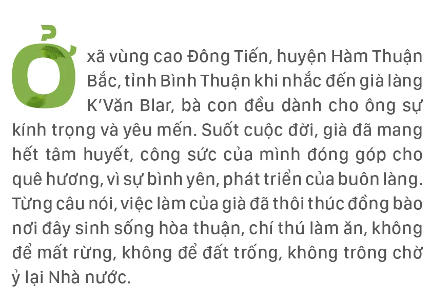 Nói về già làng K’Văn Blar, ông K’Văn Góa, Chủ tịch UBND xã Đông Tiến khẳng định già là người uy tín trong cộng đồng dân cư, có rất nhiều nỗ lực trong việc vận động bà con làm kinh tế để thoát nghèo.
