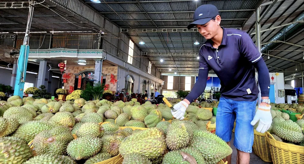Doanh nghiệp thu mua sầu riêng tại huyện Cái Bè, tỉnh Tiền Giang đang gặp khó do vướng các khâu kiểm định chất lượng. Ảnh: NGỌC PHÚC