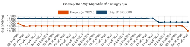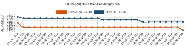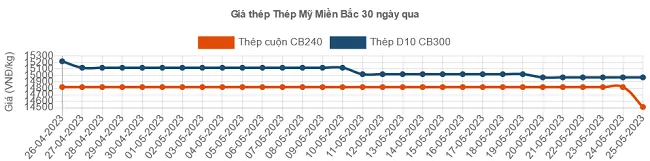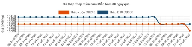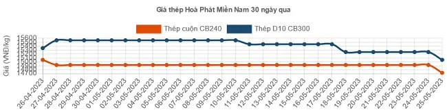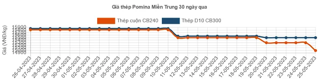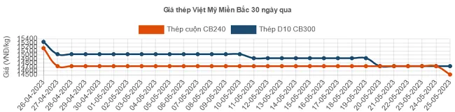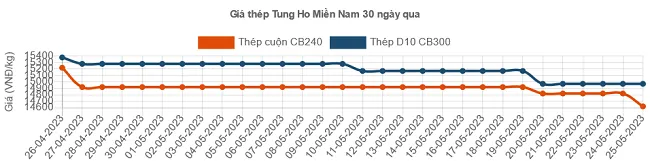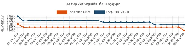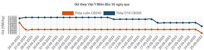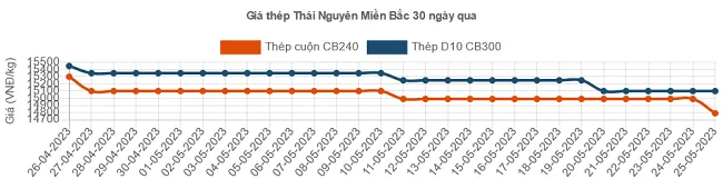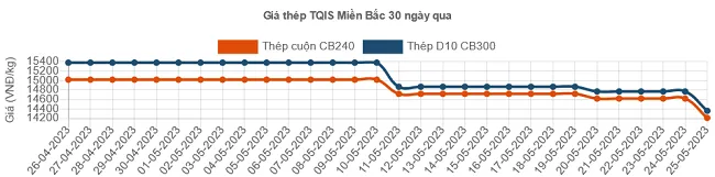 Ngày 25/5/2023, giá thép xây dựng trong nước tiếp tục được các doanh nghiệp điều chỉnh giảm thêm từ 200 đồng/kg – 510 đồng/kg. Hiện giá thép xoay quanh mức 14.360 đồng/kg - 15.500 đồng/kg (tùy từng sản phẩm và thương hiệu).