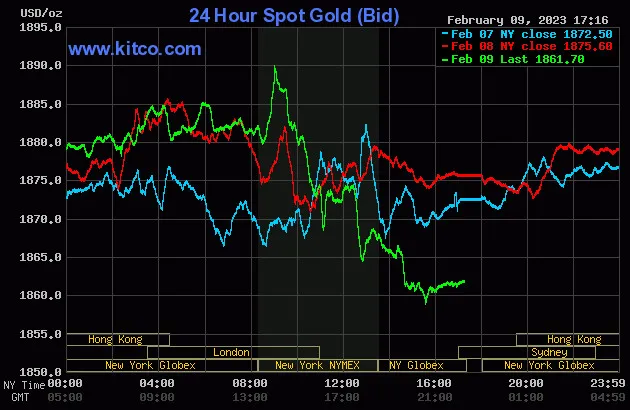 Vào lúc 5 giờ 15 phút sáng hôm nay 10/2 (giờ Việt Nam), giá vàng giao ngay thế giới niêm yết trên Kitco neo ở mức 1.861,70 USD/ounce, quy đổi tương đương 53,506 triệu đồng/lượng.