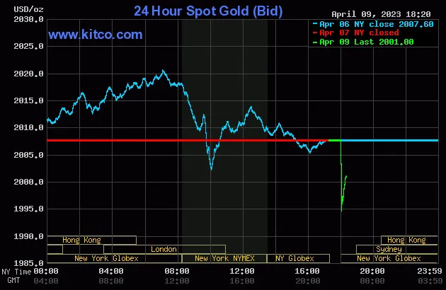 Vào lúc 5 giờ 20 phút sáng hôm nay 10/4 (giờ Việt Nam), giá vàng giao ngay thế giới niêm yết trên Kitco neo ở mức 2.001 USD/ounce, quy đổi tương đương 57,581 triệu đồng/lượng.