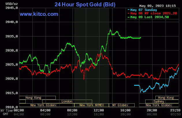 Vào lúc 5 giờ 15 phút sáng hôm nay 10/5 (giờ Việt Nam), giá vàng giao ngay thế giới niêm yết trên Kitco neo ở mức 2.034,50 USD/ounce, quy đổi tương đương 58,570 triệu đồng/lượng.