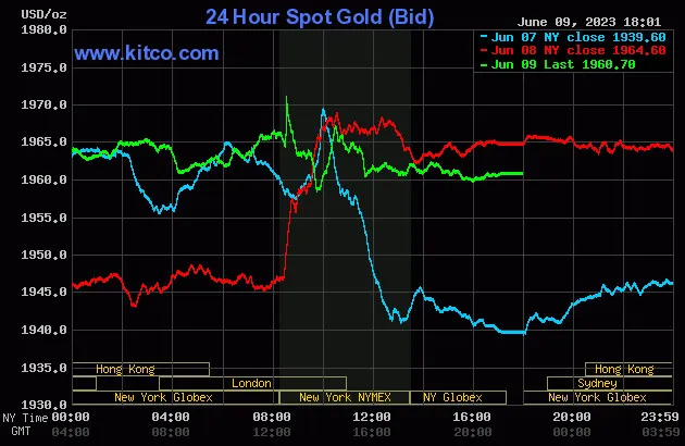 Vào lúc 5 giờ 00 phút sáng hôm nay 10/6 (giờ Việt Nam), giá vàng giao ngay thế giới niêm yết trên Kitco neo ở mức 1.960,70 USD/ounce, quy đổi tương đương 56,494 triệu đồng/lượng.