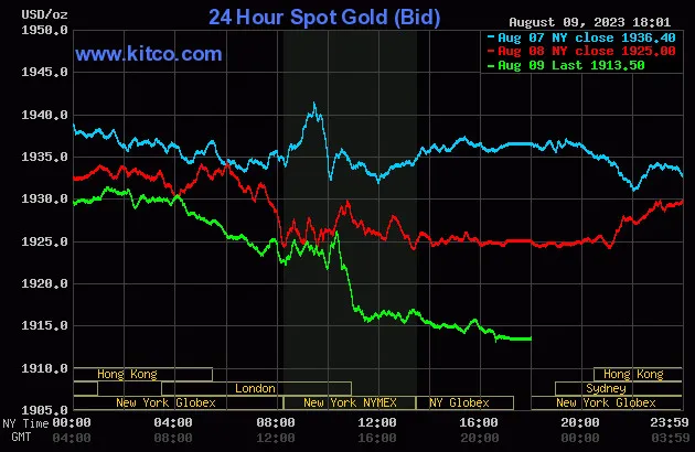Vào lúc 5 giờ 00 phút sáng hôm nay 10/8 (giờ Việt Nam), giá vàng giao ngay thế giới niêm yết trên Kitco neo ở mức 1.913,50 USD/ounce, quy đổi tương đương 55,741 triệu đồng/lượng.
