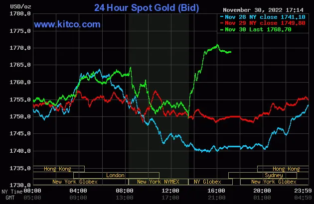 Vào lúc 5 giờ 15 phút sáng hôm nay 1/12 (giờ Việt Nam), giá vàng giao ngay thế giới niêm yết trên Kitco neo ở mức 1.768,70 USD/ounce, quy đổi tương đương 52,773 triệu đồng/lượng.