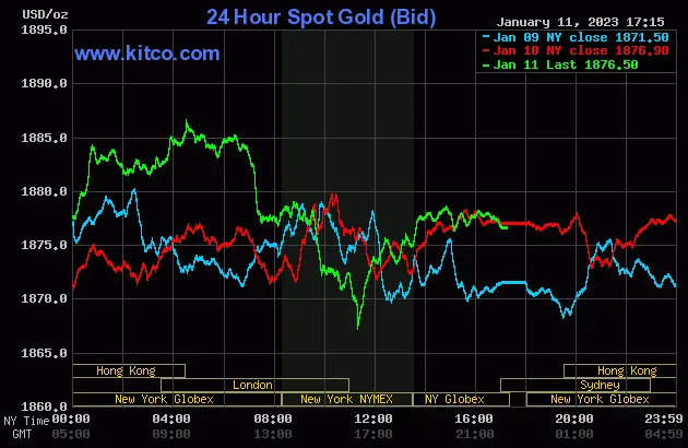 Vào lúc 5 giờ 15 phút sáng hôm nay 12/1 (giờ Việt Nam), giá vàng giao ngay thế giới niêm yết trên Kitco neo ở mức 1.876,50 USD/ounce, quy đổi tương đương 53,599 triệu đồng/lượng.