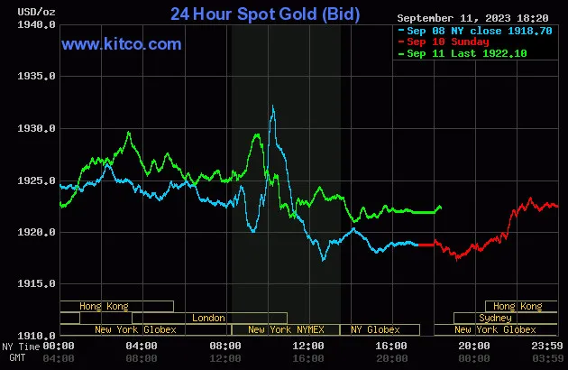 Vào lúc 5 giờ 20 phút sáng hôm nay 12/9 (giờ Việt Nam), giá vàng giao ngay thế giới niêm yết trên Kitco neo ở mức 1.922,10 USD/ounce, quy đổi tương đương 56,729 triệu đồng/lượng. Trong khi giá vàng tương lai của Mỹ tăng 0,2% ở mức 1.947,20 USD.