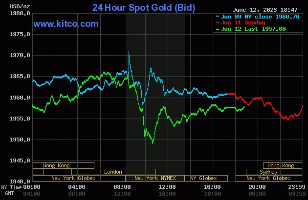 Vào lúc 5 giờ 45 phút sáng hôm nay 13/6 (giờ Việt Nam), giá vàng giao ngay thế giới niêm yết trên Kitco neo ở mức 1.957,60 USD/ounce, quy đổi tương đương 56,381 triệu đồng/lượng.