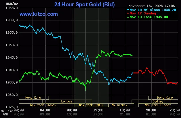 Vào lúc 5 giờ 05 phút sáng hôm nay 14/11 (giờ Việt Nam), giá vàng giao ngay thế giới niêm yết trên Kitco neo ở mức 1.945,80 USD/ounce, quy đổi tương đương 58,175 triệu đồng/lượng.
