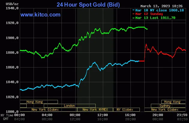 Vào lúc 5 giờ 25 phút sáng hôm nay 14/3 (giờ Việt Nam), giá vàng giao ngay thế giới niêm yết trên Kitco neo ở mức 1.911,7 USD/ounce, quy đổi tương đương 55,292 triệu đồng/lượng.