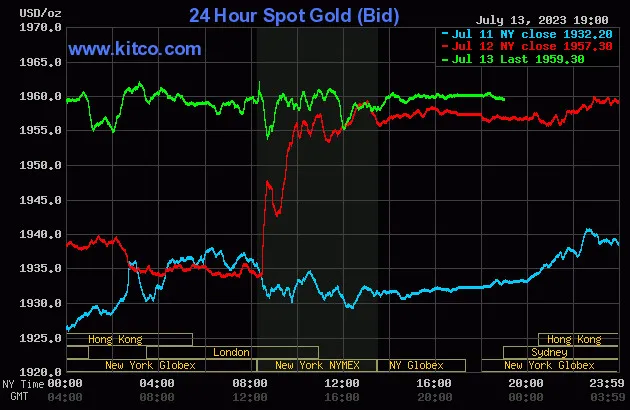 Vào lúc 6 giờ 00 phút sáng hôm nay 14/7 (giờ Việt Nam), giá vàng giao ngay thế giới niêm yết trên Kitco neo ở mức 1.959,30 USD/ounce, quy đổi tương đương 56,847 triệu đồng/lượng. Giá vàng kỳ hạn của Mỹ tăng 0,2% lên 1.964,60 USD.