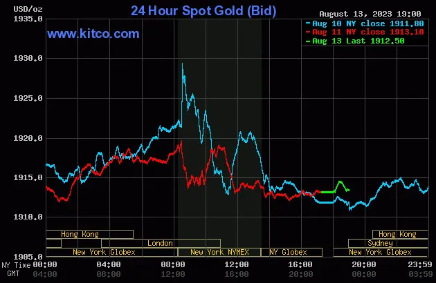 Vào lúc 6 giờ 00 phút sáng hôm nay 14/8 (giờ Việt Nam), giá vàng giao ngay thế giới niêm yết trên Kitco neo ở mức 1.912,50 USD/ounce, quy đổi tương đương 55,712 triệu đồng/lượng.