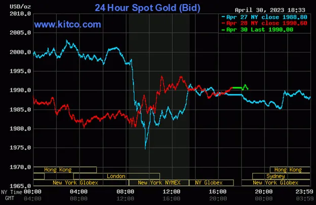 Vào lúc 5 giờ 30 phút sáng hôm nay 1/5 (giờ Việt Nam), giá vàng giao ngay thế giới niêm yết trên Kitco neo ở mức 1.990 USD/ounce, quy đổi tương đương 57,295 triệu đồng/lượng.