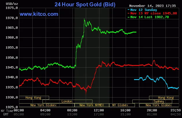 Vào lúc 5 giờ 35 phút sáng hôm nay 15/11 (giờ Việt Nam), giá vàng giao ngay thế giới niêm yết trên Kitco neo ở mức 1.962,70 USD/ounce, quy đổi tương đương 58,656 triệu đồng/lượng.