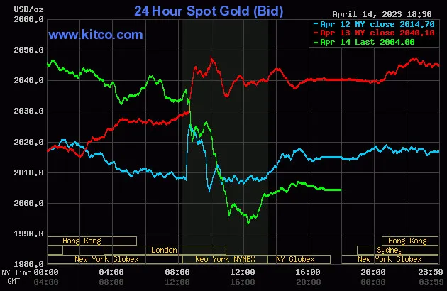 Vào lúc 5 giờ 30 phút sáng hôm nay 15/4 (giờ Việt Nam), giá vàng giao ngay thế giới niêm yết trên Kitco neo ở mức 2.004USD/ounce, quy đổi tương đương 57,668 triệu đồng/lượng.