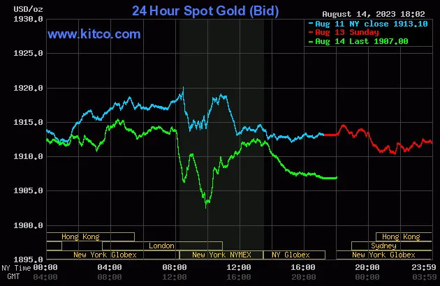 Vào lúc 5 giờ 00 phút sáng hôm nay 15/8 (giờ Việt Nam), giá vàng giao ngay thế giới niêm yết trên Kitco neo ở mức 1.907USD/ounce, quy đổi tương đương 55,737 triệu đồng/lượng.