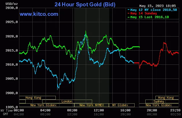 Vào lúc 5 giờ 05 phút sáng hôm nay 16/5 (giờ Việt Nam), giá vàng giao ngay thế giới niêm yết trên Kitco neo ở mức 2.016.10 USD/ounce, quy đổi tương đương 58,016 triệu đồng/lượng.