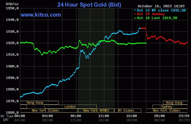 Vào lúc 5 giờ 00 phút sáng hôm nay 17/10 (giờ Việt Nam), giá vàng giao ngay thế giới niêm yết trên Kitco neo ở mức 1.919,50 USD/ounce, quy đổi tương đương 57,599 triệu đồng/lượng.