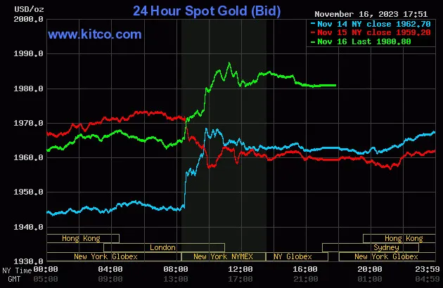 Vào lúc 5 giờ 50 phút sáng hôm nay 17/11 (giờ Việt Nam), giá vàng giao ngay thế giới niêm yết trên Kitco neo ở mức 1.980,80 USD/ounce, quy đổi tương đương 59,015 triệu đồng/lượng.