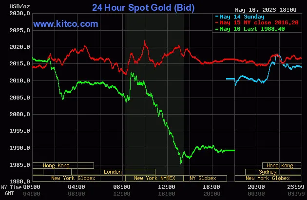 Vào lúc 5 giờ 00 phút sáng hôm nay 17/5 (giờ Việt Nam), giá vàng giao ngay thế giới niêm yết trên Kitco neo ở mức 1.988,40USD/ounce, quy đổi tương đương 57,219 triệu đồng/lượng.