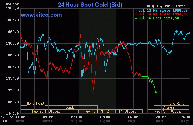 Vào lúc 6 giờ 20 phút sáng hôm nay 17/7 (giờ Việt Nam), giá vàng giao ngay thế giới niêm yết trên Kitco neo ở mức 1.951,50 USD/ounce, quy đổi tương đương 56,609 triệu đồng/lượng.