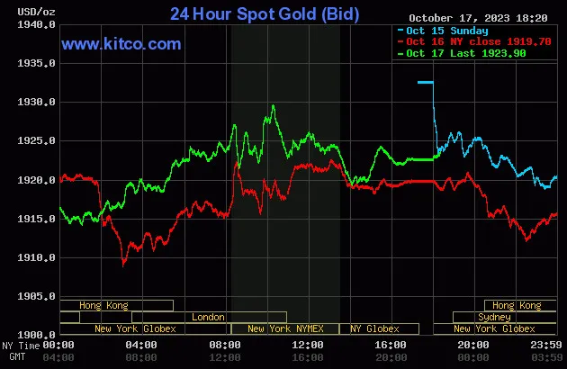 Vào lúc 5 giờ 20 phút sáng hôm nay 18/10 (giờ Việt Nam), giá vàng giao ngay thế giới niêm yết trên Kitco neo ở mức 1.923,90 USD/ounce, quy đổi tương đương 57,820 triệu đồng/lượng.