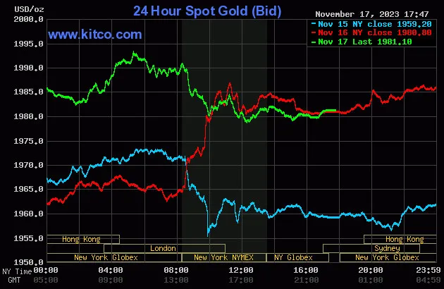 Vào lúc 5 giờ 45 phút sáng hôm nay 18/11 (giờ Việt Nam), giá vàng giao ngay thế giới niêm yết trên Kitco neo ở mức 1.981,10USD/ounce, quy đổi tương đương 58,928 triệu đồng/lượng.