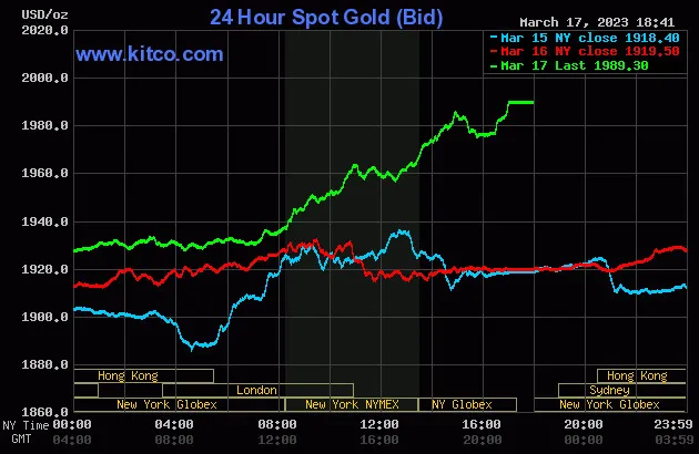 Vào lúc 5 giờ 40 phút sáng hôm nay 18/3 (giờ Việt Nam), giá vàng giao ngay thế giới niêm yết trên Kitco neo ở mức 1.989,3 USD/ounce, quy đổi tương đương 57,560 triệu đồng/lượng.