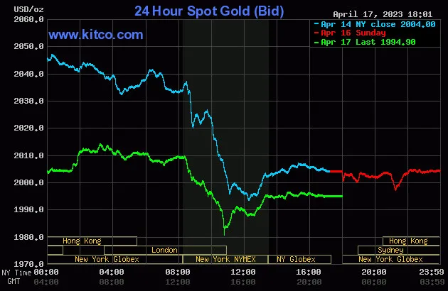Vào lúc 5 giờ 00 phút sáng hôm nay 18/4 (giờ Việt Nam), giá vàng giao ngay thế giới niêm yết trên Kitco neo ở mức 1.994,90USD/ounce, quy đổi tương đương 57,503 triệu đồng/lượng.