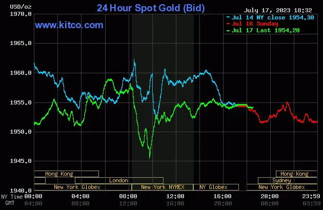Vào lúc 5 giờ 30 phút sáng hôm nay 18/7 (giờ Việt Nam), giá vàng giao ngay thế giới niêm yết trên Kitco neo ở mức 1.954,20 USD/ounce, quy đổi tương đương 56,664 triệu đồng/lượng.