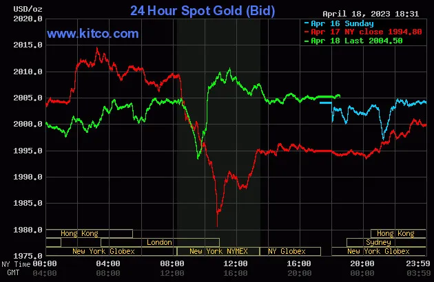 Vào lúc 5 giờ 30 phút sáng hôm nay 19/4 (giờ Việt Nam), giá vàng giao ngay thế giới niêm yết trên Kitco neo ở mức 2.004,50 USD/ounce, quy đổi tương đương 57,877 triệu đồng/lượng.