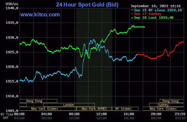 Vào lúc 5 giờ 15 phút sáng hôm nay 19/9 (giờ Việt Nam), giá vàng giao ngay thế giới niêm yết trên Kitco neo ở mức 1.933,40 USD/ounce, quy đổi tương đương 57,781 triệu đồng/lượng. Giá vàng kỳ hạn của Mỹ tăng 0,4% ở mức 1.953,40 USD.