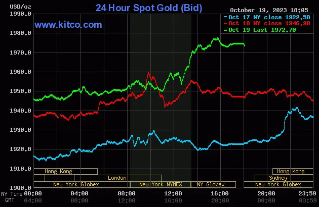 Vào lúc 5 giờ 05 phút sáng hôm nay 20/10 (giờ Việt Nam), giá vàng giao ngay thế giới niêm yết trên Kitco neo ở mức 1.972,70 USD/ounce, quy đổi tương đương 59,387 triệu đồng/lượng. Giá vàng kỳ hạn của Mỹ tăng 0,6% ở mức 1.980,50 USD.