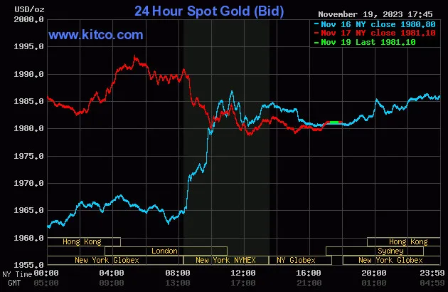 Vào lúc 5 giờ 45 phút sáng hôm nay 20/11 (giờ Việt Nam), giá vàng giao ngay thế giới niêm yết trên Kitco neo ở mức 1.981,10 USD/ounce, quy đổi tương đương 58,928 triệu đồng/lượng.