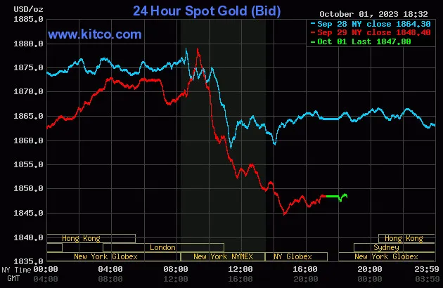 Vào lúc 5 giờ 30 phút sáng hôm nay 2/10 (giờ Việt Nam), giá vàng giao ngay thế giới niêm yết trên Kitco neo ở mức 1.847,90 USD/ounce, quy đổi tương đương 55,069 triệu đồng/lượng.