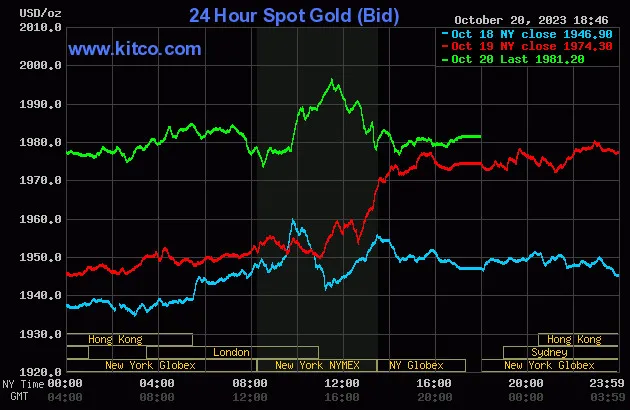 Vào lúc 5 giờ 45 phút sáng hôm nay 21/10 (giờ Việt Nam), giá vàng giao ngay thế giới niêm yết trên Kitco neo ở mức 1.981,20 USD/ounce, quy đổi tương đương 59,619 triệu đồng/lượng.