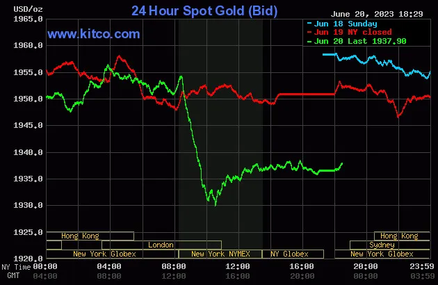 Vào lúc 5 giờ 30 phút sáng hôm nay 21/6 (giờ Việt Nam), giá vàng giao ngay thế giới niêm yết trên Kitco neo ở mức 1.937,90 USD/ounce, quy đổi tương đương 55,932 triệu đồng/lượng.