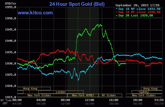 Vào lúc 5 giờ 00 phút sáng hôm nay 21/9 (giờ Việt Nam), giá vàng giao ngay thế giới niêm yết trên Kitco neo ở mức 1.929,80USD/ounce, quy đổi tương đương 57,555 triệu đồng/lượng. Giá vàng tương lai của Mỹ tăng 0,7% ở mức 1.967,10 USD.