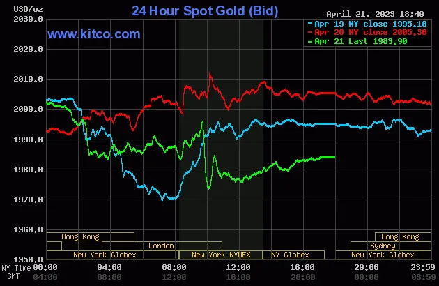 Vào lúc 5 giờ 40 phút sáng hôm nay 22/4 (giờ Việt Nam), giá vàng giao ngay thế giới niêm yết trên Kitco neo ở mức 1.983,90USD/ounce, quy đổi tương đương 57,186 triệu đồng/lượng.