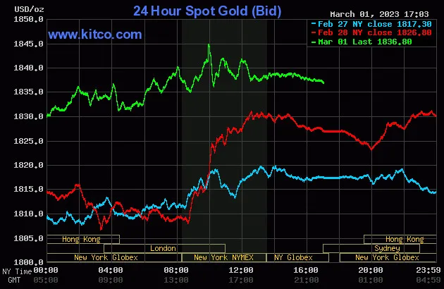 Vào lúc 5 giờ 00 phút sáng hôm nay 2/3 (giờ Việt Nam), giá vàng giao ngay thế giới niêm yết trên Kitco neo ở mức 1.836,80 USD/ounce, quy đổi tương đương 53,195 triệu đồng/lượng.