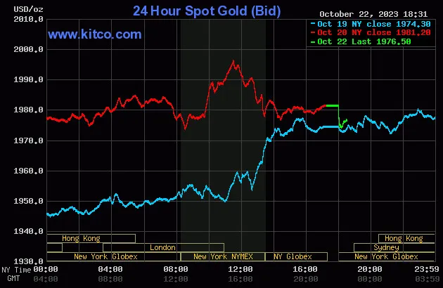 Vào lúc 5 giờ 30 phút sáng hôm nay 23/10 (giờ Việt Nam), giá vàng giao ngay thế giới niêm yết trên Kitco neo ở mức 1.976,50 USD/ounce, quy đổi tương đương 59,477 triệu đồng/lượng.