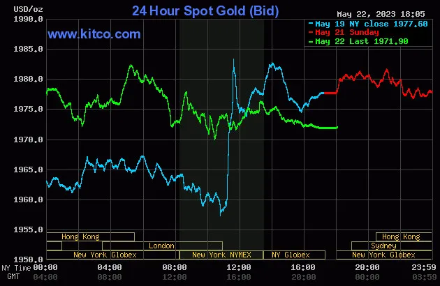 Vào lúc 5 giờ 05 phút sáng hôm nay 23/5 (giờ Việt Nam), giá vàng giao ngay thế giới niêm yết trên Kitco neo ở mức 1.971,90USD/ounce, quy đổi tương đương 56,732 triệu đồng/lượng. Lần cuối cùng, giá vàng tháng 6 giảm 7,80 USD xuống 1.973,90USD/ounce và giá bạc tháng 7 giảm 0,27 USD xuống 23,79USD/ounce.