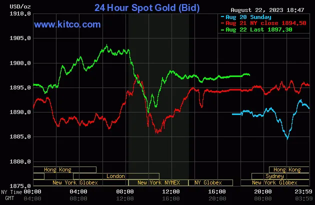 Vào lúc 5 giờ 45 phút sáng hôm nay 23/8 (giờ Việt Nam), giá vàng giao ngay thế giới niêm yết trên Kitco neo ở mức 1.897,30 USD/ounce, quy đổi tương đương 55,639 triệu đồng/lượng.