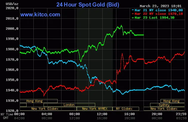 Vào lúc 5 giờ 00 phút sáng hôm nay 24/3 (giờ Việt Nam), giá vàng giao ngay thế giới niêm yết trên Kitco neo ở mức 1.994,30 USD/ounce, quy đổi tương đương 57,510 triệu đồng/lượng.