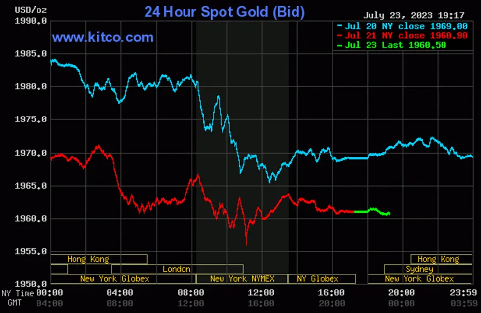 Vào lúc 6 giờ 15 phút sáng hôm nay 24/7 (giờ Việt Nam), giá vàng giao ngay thế giới niêm yết trên Kitco neo ở mức 1.960,50 USD/ounce, quy đổi tương đương 56,894 triệu đồng/lượng.
